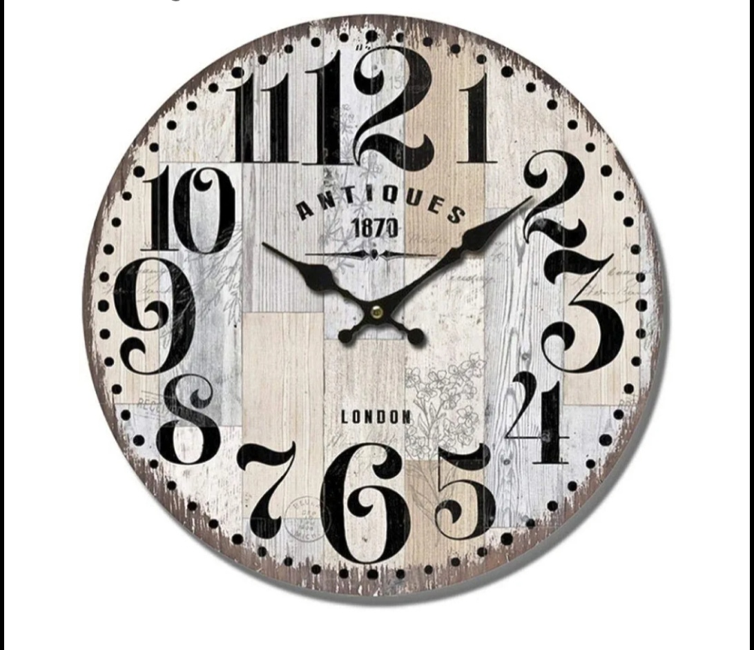 التصميم: ساعة دائرية بنمط ريفي (Rustic) مع خلفية مطبوعة تبدو كألواح خشبية متراصة بألوان باهتة (Beige/Grey).