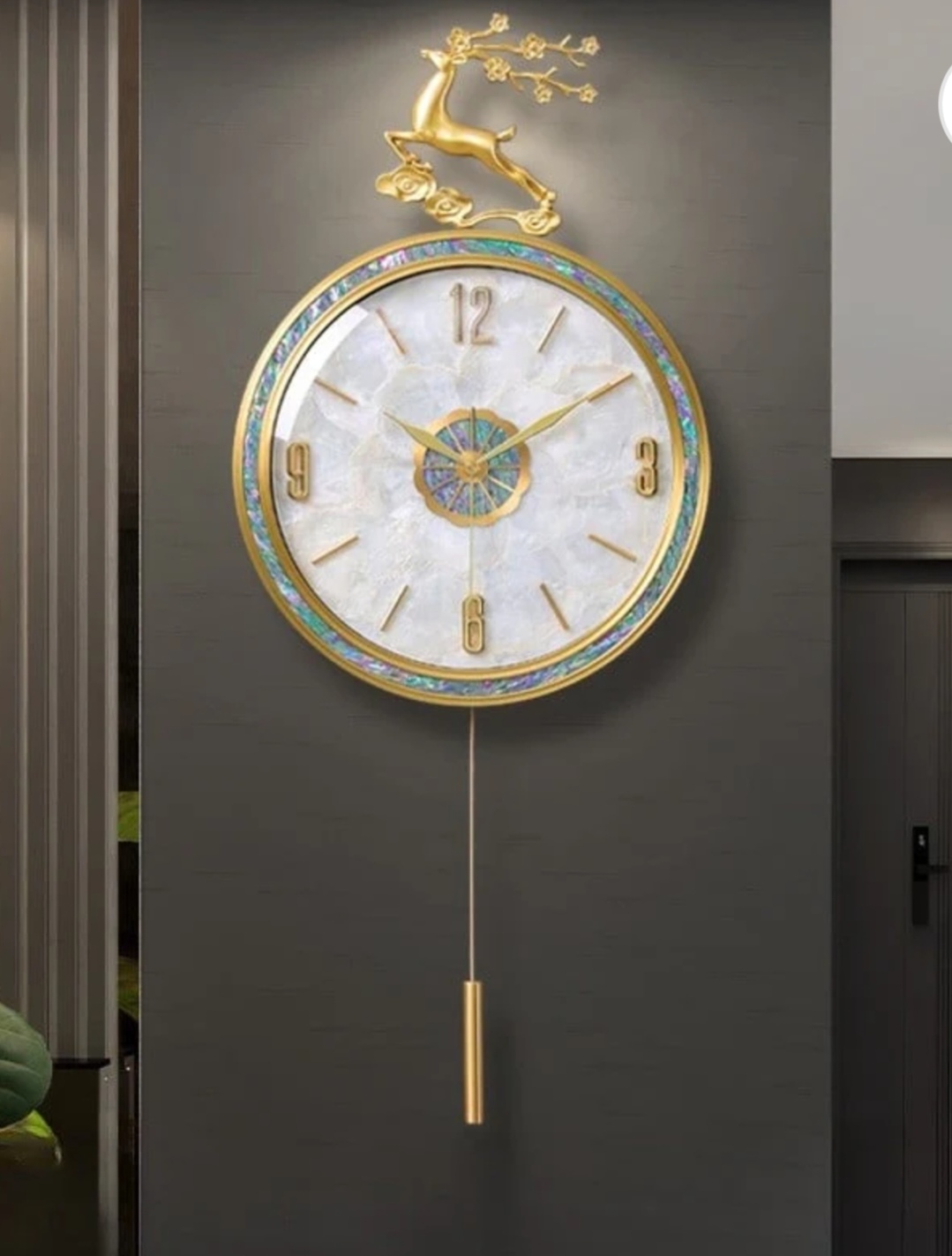 التصميم: تتميز بوجود تمثال غزال ذهبي في الأعلى (يرمز غالباً للفخامة والحظ في الديكور) مع بندول (نواس) معدني طويل يتدلى من الأسفل.